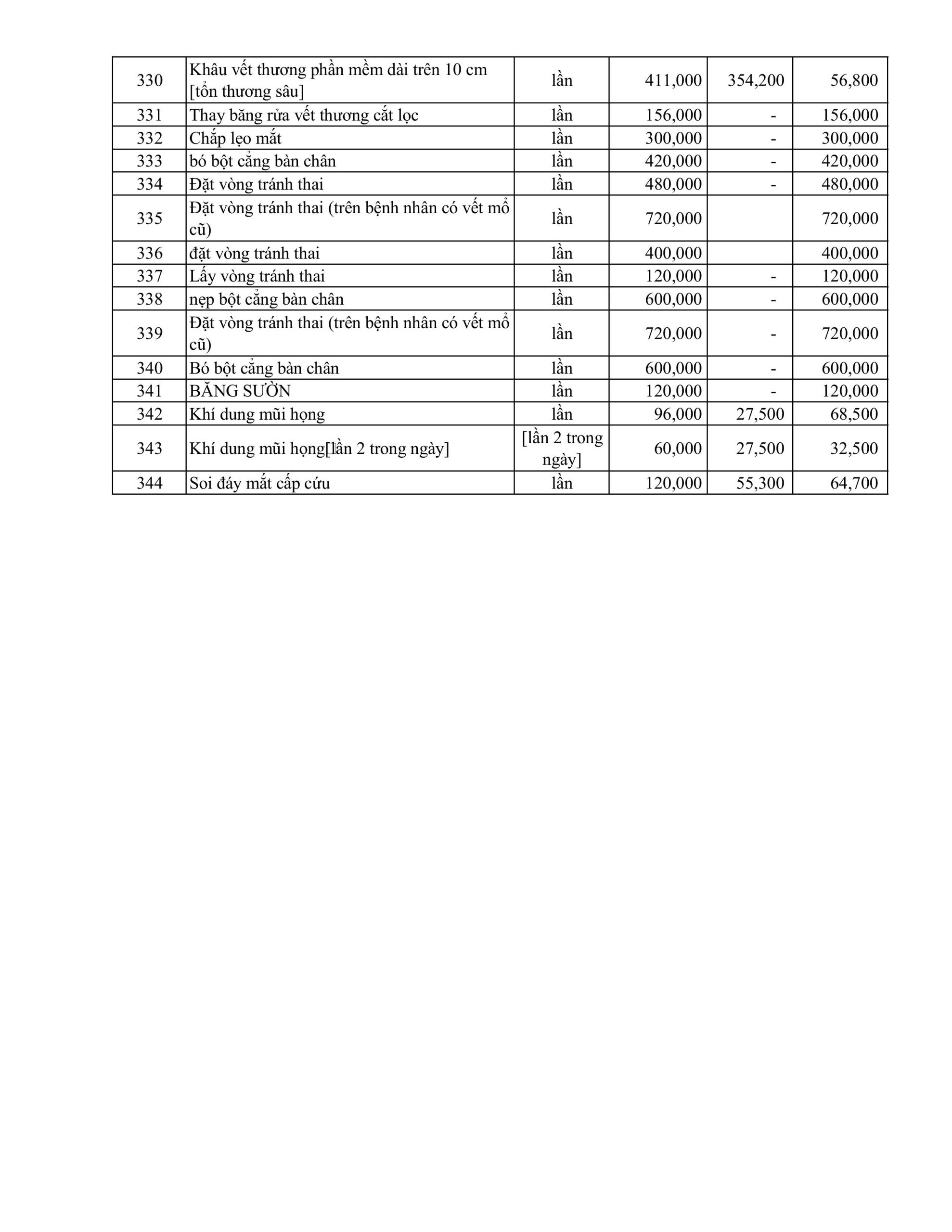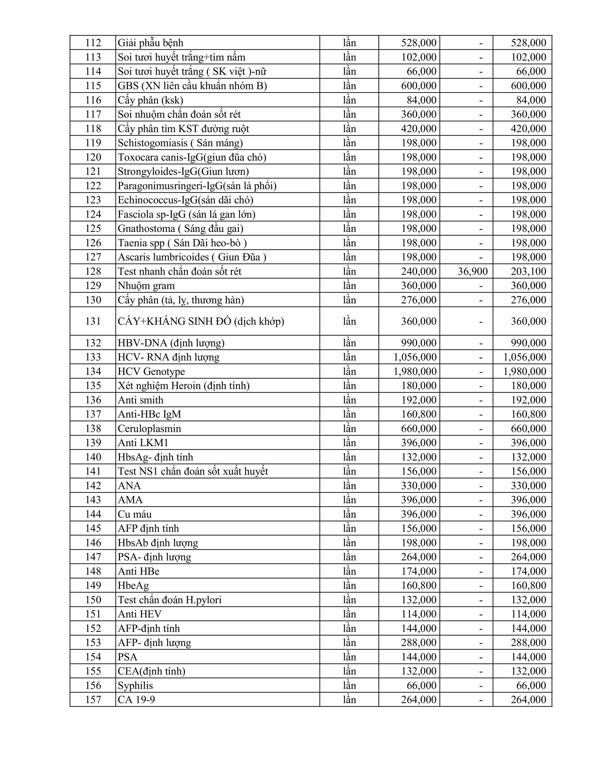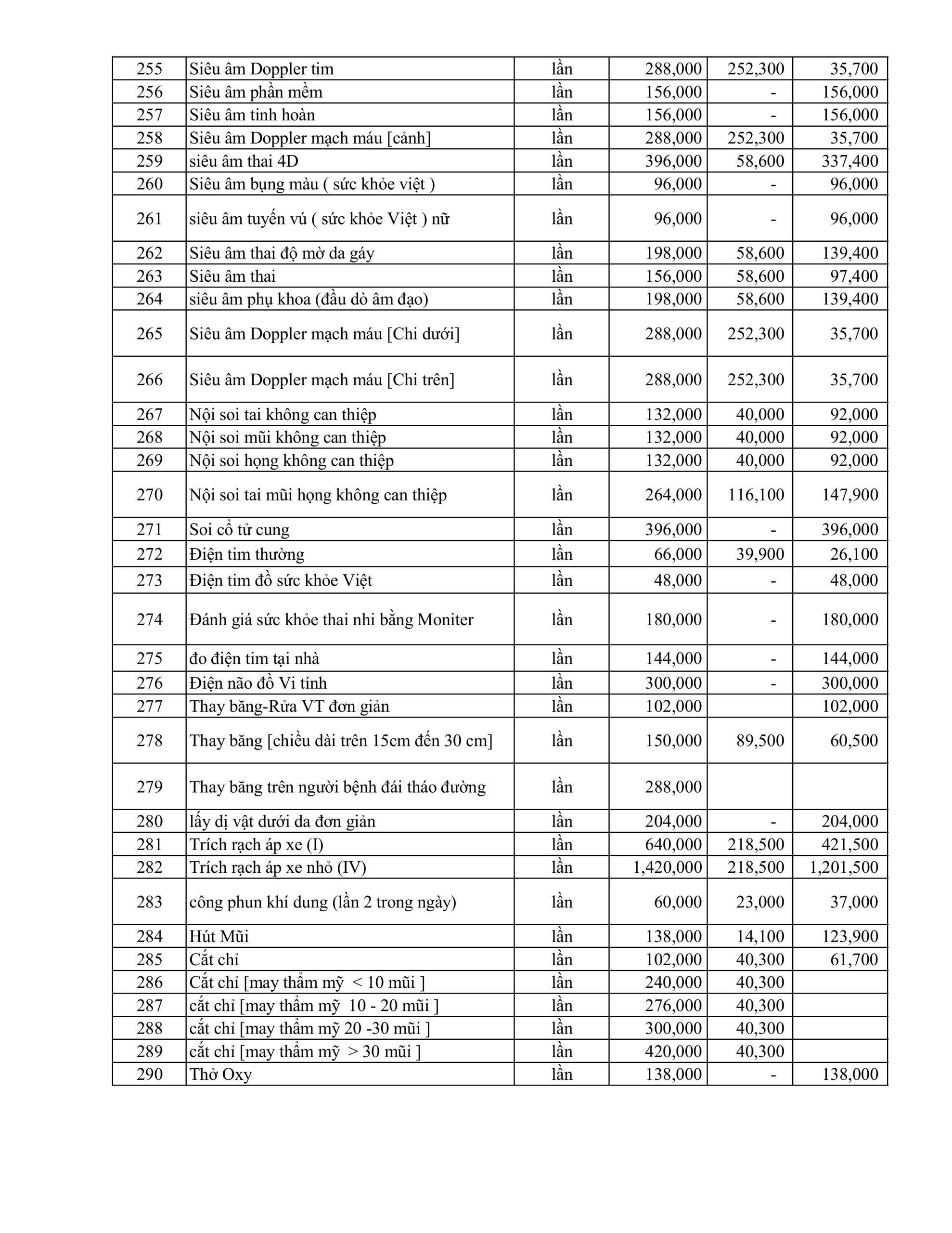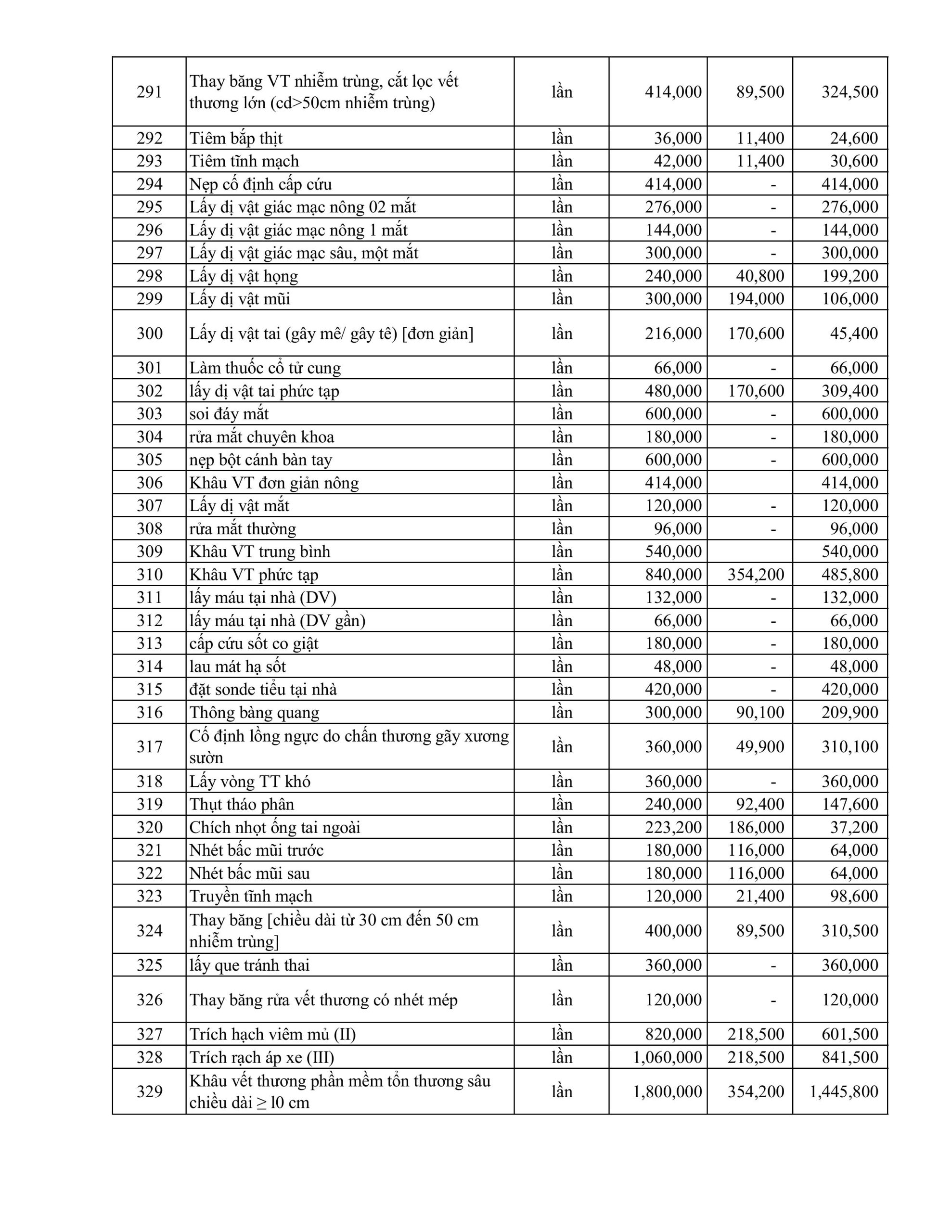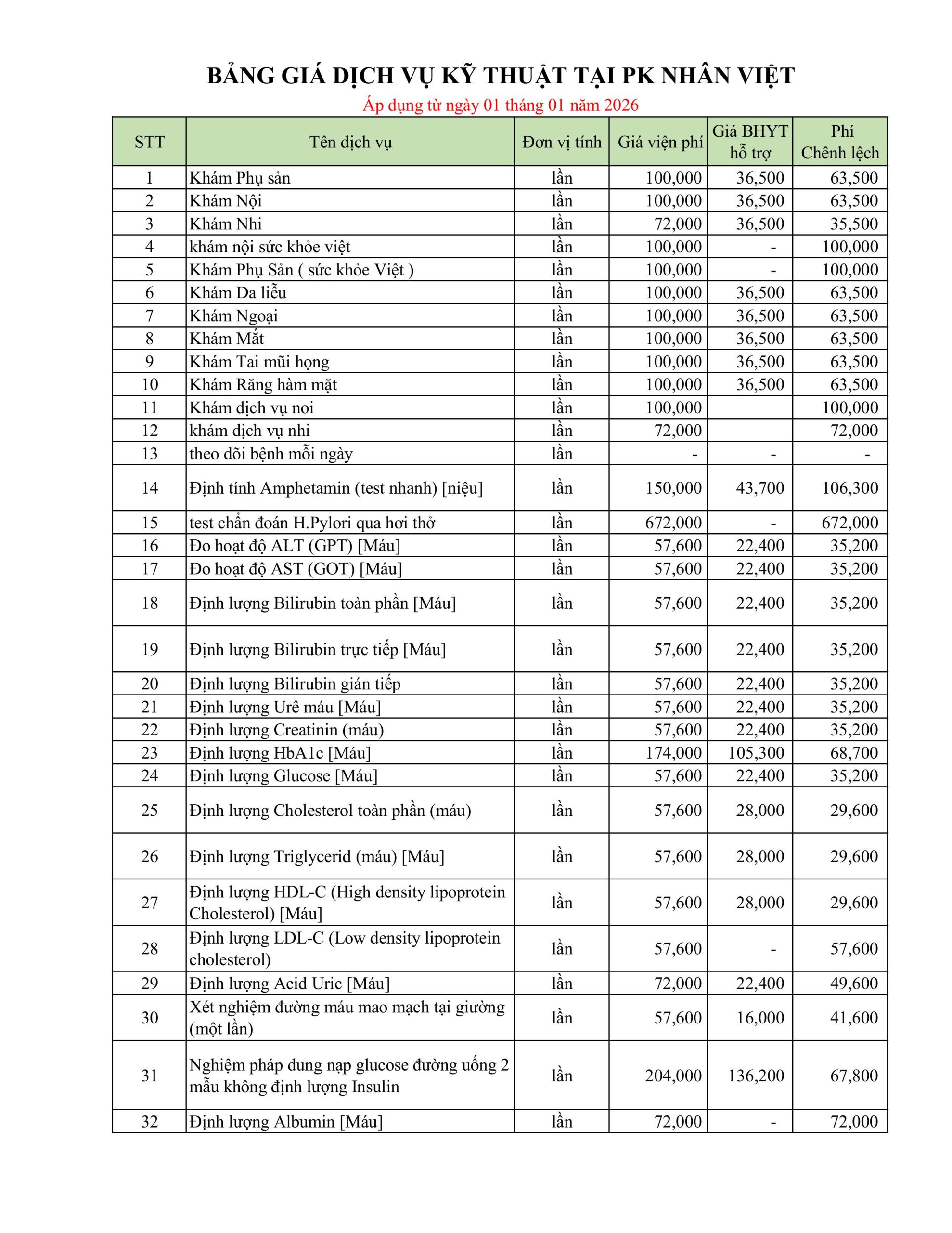 BẢNG GIÁ DỊCH VỤ KỸ THUẬT ÁP DUNG THÁNG 1.2026